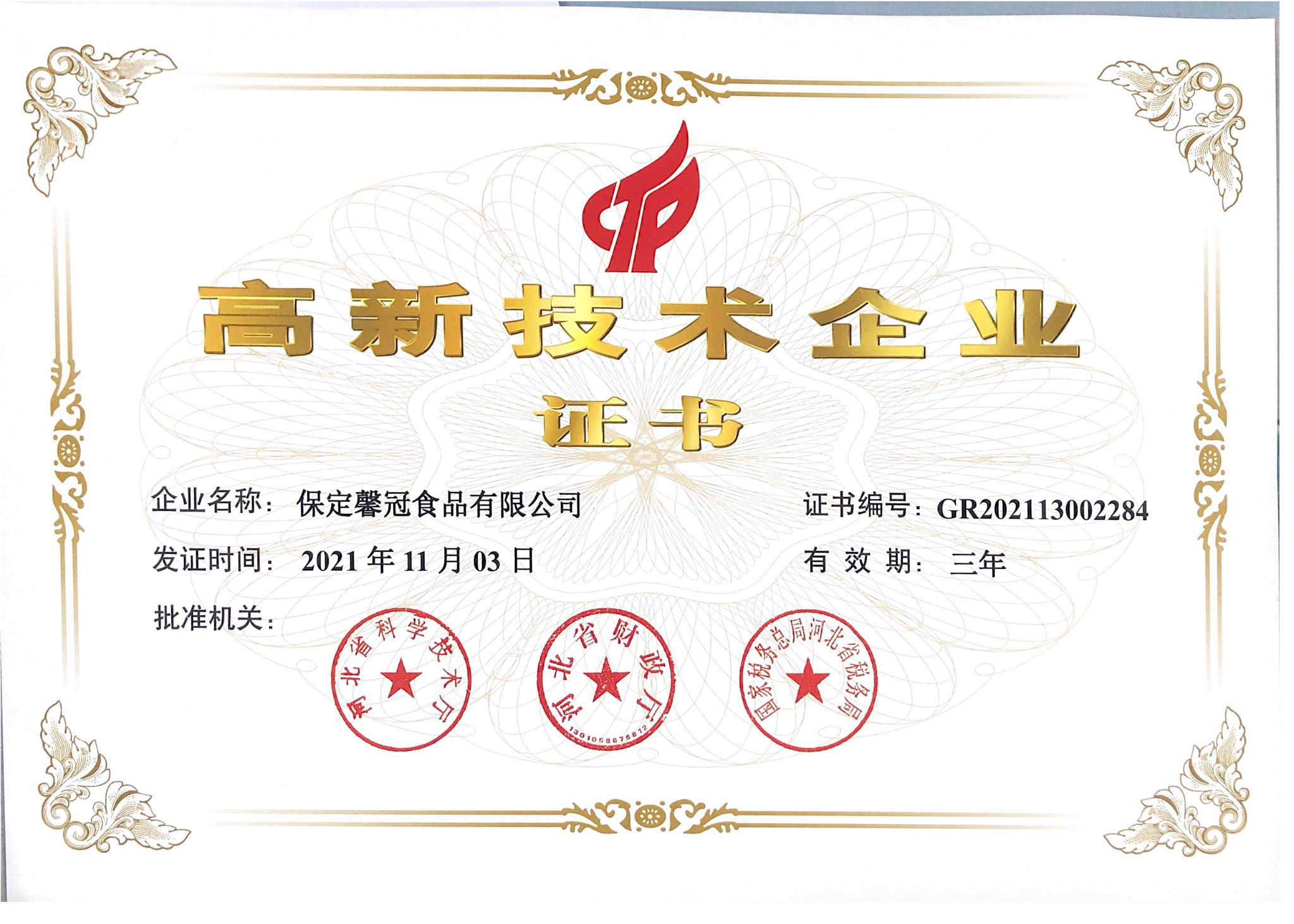 祝賀保定馨冠食品有限公司被評為“高新技術企業(yè)”